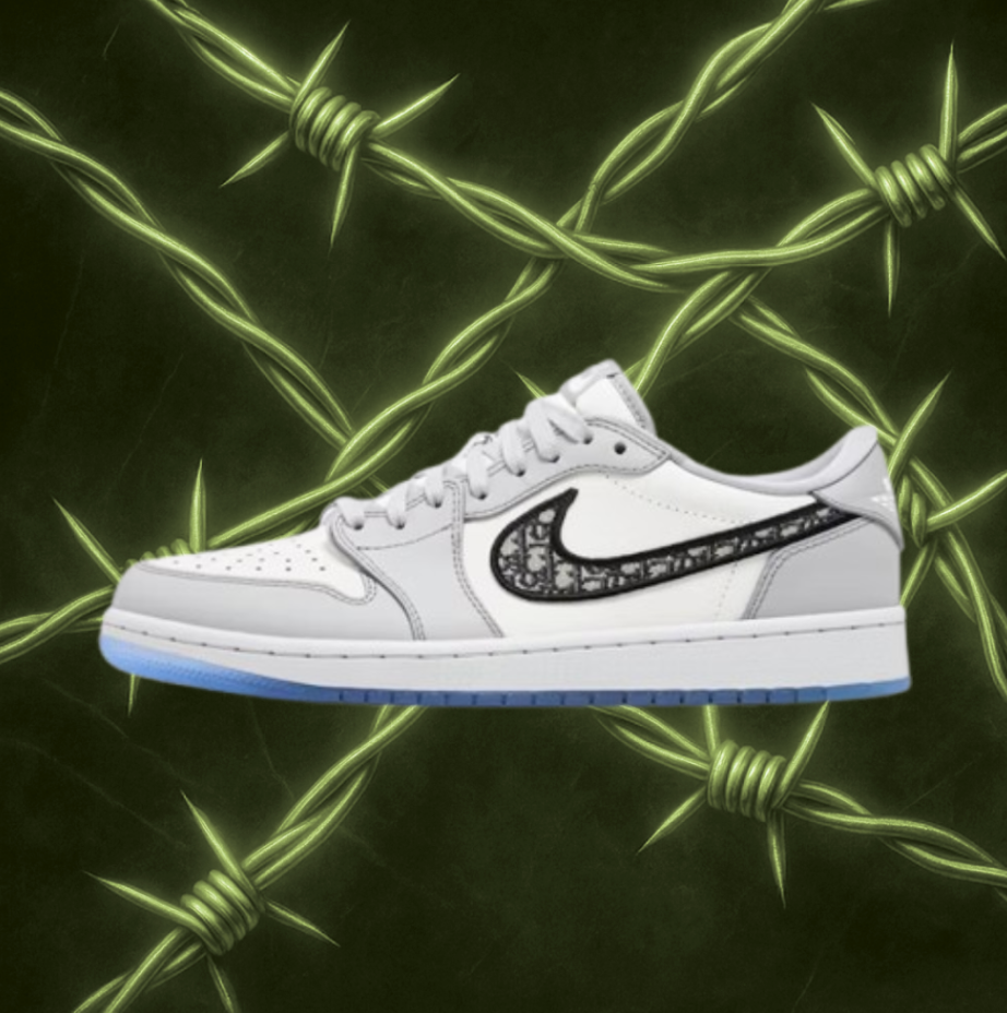 The Dior x Air Jordan 1 Low is the result of the iconic collaboration between the fashion brand and the iconic sportswear legend. Combining the two brands, the Dior x Air Jordan 1 Low comes completed with a Nike swoosh that's made unique by the Dior-logo fabric, and the fashion label is printed on the soft blue rubber sole of the shoe. This sneaker is created in smooth, luxury leather in a soft shade of grey and complemented by clean white. To complete the look, a daring blue is used on the sole of the Dior x Air Jordan 1 Low. The low ankle is padded for ultimate comfort, and the original Air Jordan wing logo gets a revamp here with a stylish Air Dior instead, resulting in a beautiful piece of footwear.