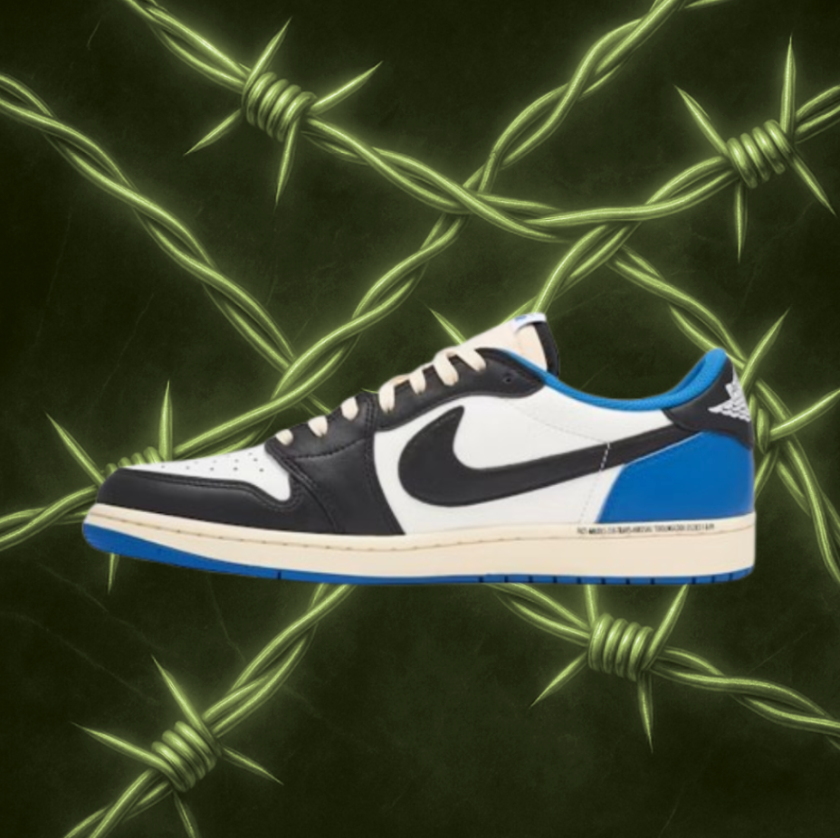 In perhaps the most insane collaboration we have seen in sneakers, Jordan Brand joins forces with Travis Scott and Fragment Designs for a unique take on the Air Jordan 1 low, making the brand new Travis Scott Fragment Jordan 1 Low sought after around the world. The Travis Scott Fragment Low silhouette picks the best design aspects from previous Scott and Fragment releases. The colourway is reminiscent of the legendary Fragment Design AJ1 released in 2014, with premium white, blue and black leather throughout. The staple design from Scott's Jordan drops is the backwards swoosh, which features on the lateral side of each shoe. Dual branding can be found throughout, with the Cactus Jack, Fragment Designs and the Jordan Brand logos all featuring. You will find The OG Jordan Brand wings logo on the heel tab on the low version. Underfoot the Travis Scott Fragment Jordan 1 Low, a traditional Jordan sole unit features fully covered in a sail colourway. This sole unit houses Nike Air technology to guarantee optimum comfort wear after wear. Don't miss out on a chance to get your hands on a pair of Travis Scott Jordan 1 Fragment sneakers!