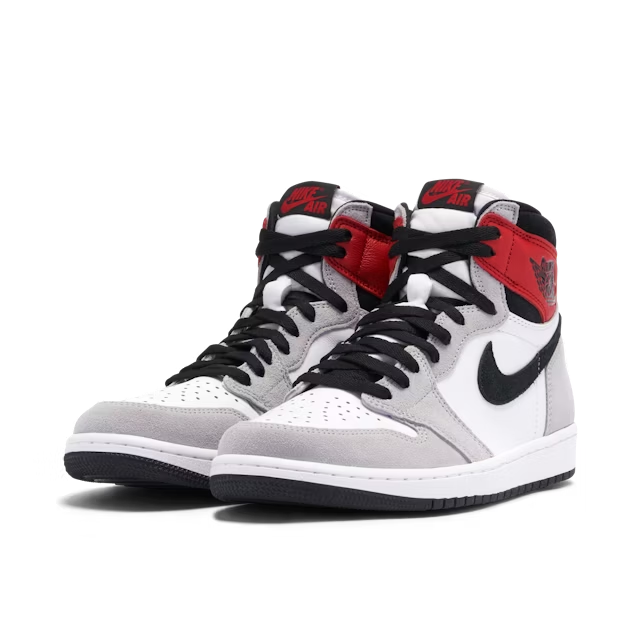 Smoke grey and bold red work in harmony showcased in the iconic Air Jordan 1 High OG Smoke Grey with ultimate retro vibes. The classic Jordan wings logo is stamped on the side in black against a bold red ankle detail, the perfect contrast against softer shades of smoky grey. The subtle additions of bold colour are made more prominent by an otherwise neutral sneaker in white leather panels, white leather base, and grey overlays. The suede panelling in grey helps to complete the softer look of the Air Jordan 1 High OG Smoke Grey whilst still maintaining its versatility and stylish design. The Nike swoosh stands out in black against white leather, complete with black lacing helping to bring out pops of dark detailing against a lighter structure. Ultimate comfort meets stylish design in this pair of Air Jordan 1 High OG Smoke Grey's.